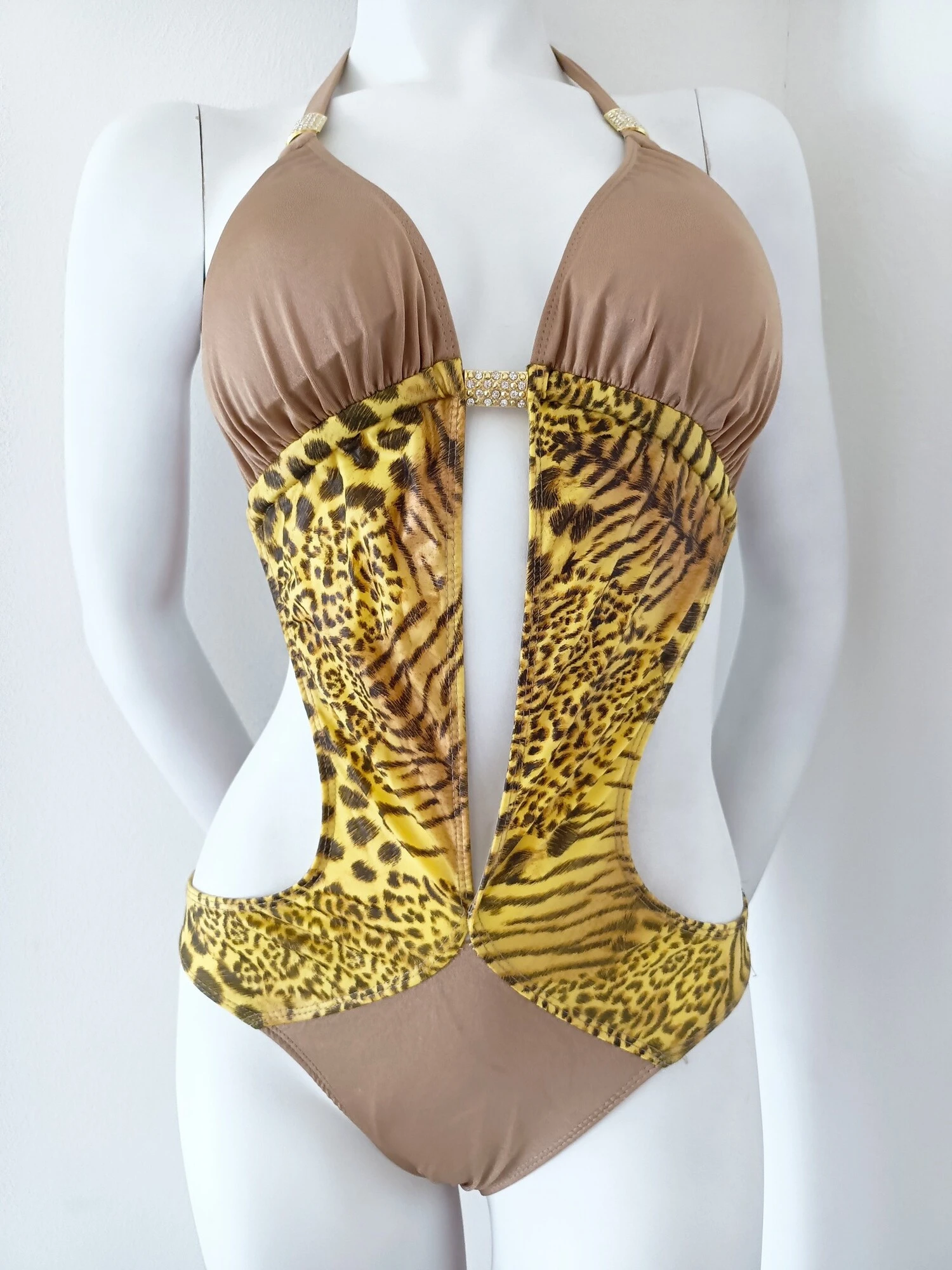 Dámské jednodílné plavky typu monokiny se zvířecím vzorem.