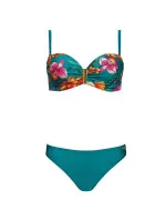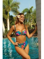 Dámské dvudílné plavky s potiskem exotických květů. Spodní díl klasické kalhotky, vrchní díl vyztužený, odepínací ramínka na posouvání.