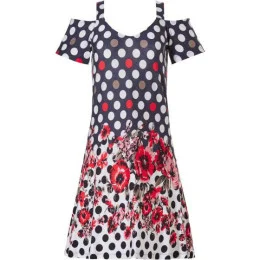 Pěkný model plážových šatů pro dámy od značky Pastunette. Šaty mají krátké rukávy a ramínka, takže ramena jsou odhalená. Veselý vzor - velké tečky v barvách červená, bílá a taupe na tmavě modrém podkladu. Pod tím je okraj krásných červených květů na bílém pozadí s černými tečkami. Pěkné plážové šaty jsou ve spodní části mírně širší.