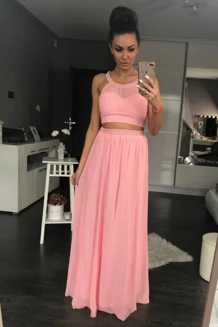 Společenské a plesové šaty dlouhé šaty. Tyto šaty se skládají z vrchního dílu a dlouhé sukně. Lem vrchního dílu a horní lem sukně je posetý perličkami v bílé a růžové barvě. Vrchní díl má všité zapínaní na zádech, dlouhá sukně má v zadní části gumu. Velmi zajímavé spojení vrchního dílu a dlouhé sukně zaručuje ženskost a především i pohodlí. Šaty si můžete vzít na společenskou událost, ale i párty. Materiál, že kterého jsou šaty vyrobeny je příjemný na omak. Kvalitní dámské šaty. Dámské značkové oblečení vyrobené pro EU.