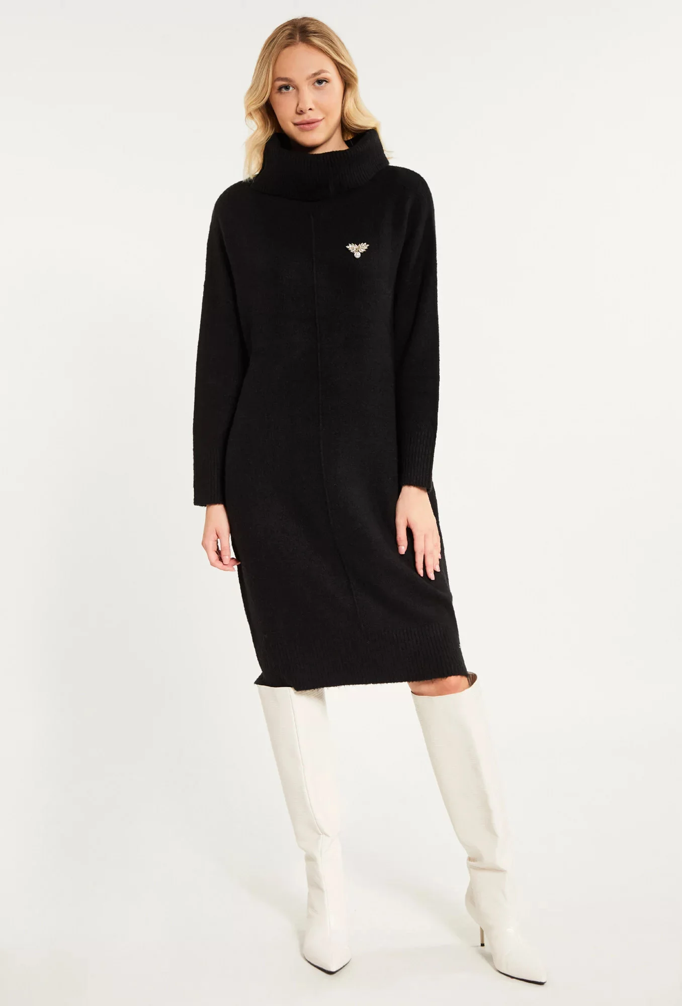 Dámské svetrové šaty se šperkovou broží. Šaty s dlouhými rukávy a vysokým límcem. Šaty v délce midi. Tento model je ideální pro chladné podzimní dny. Model na obrázku je vysoký 177 cm a má velikost 36.