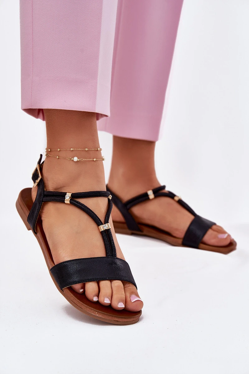 Ploché dámské sandály vyrobené z kvalitní ekokože. Uzavírání na nastavitelný popruh s přezkou zajistí ideální přizpůsobení a pohodlí při nošení. Ideální na teplé dny, kombinují styl s funkcionalitou, skvěle se hodí jak na každodenní procházky, tak i na elegančnější události. Při výběru velikosti se řiďte tabulkou velikostí.
