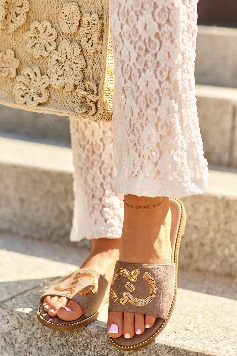 Dámské ploché pantofle s flitry S.Barski Hnědá