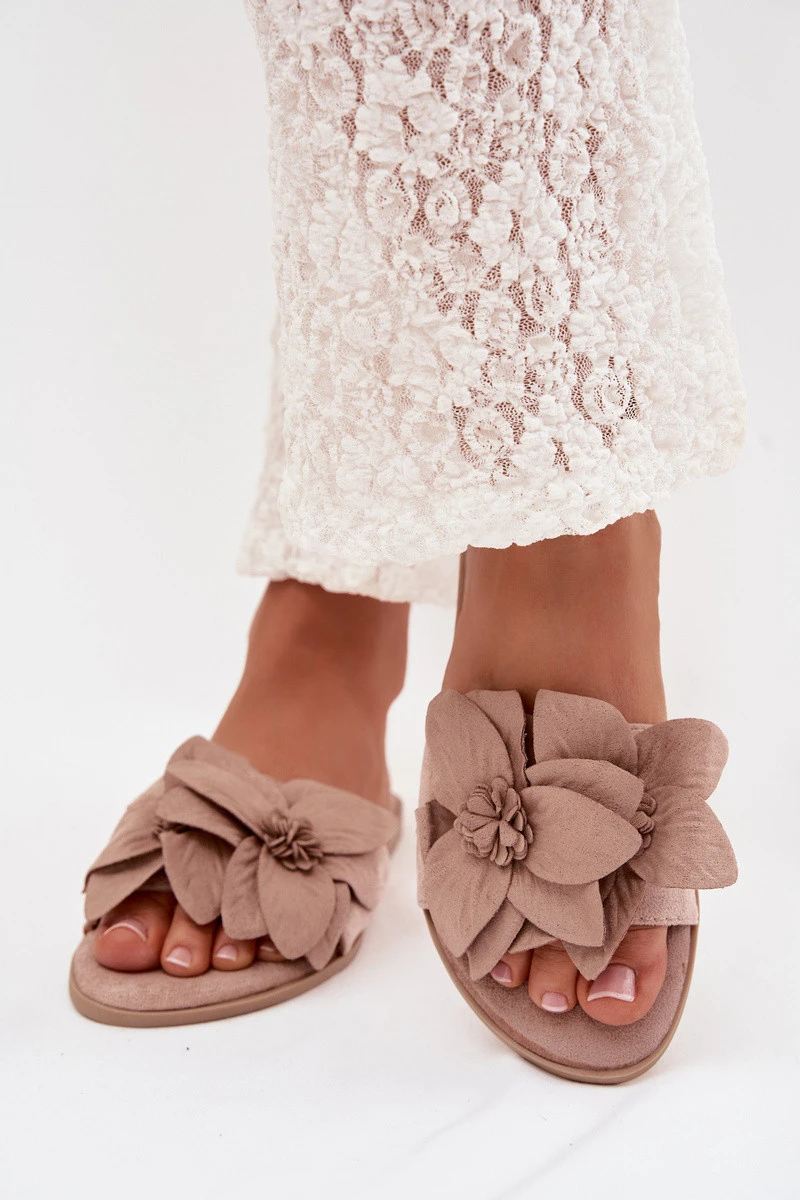 Dámské ploché pantofle s ozdobnými květy Béžové Elzoria