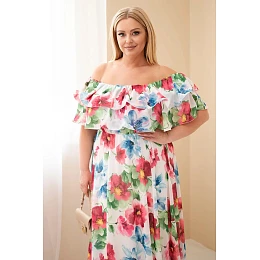 Efektní dámské šaty Plus Size v hispánském stylu jsou vynikající volbou pro ženy, které si přejí spojit pohodlí s módním vzhledem. Model okouzluje krásným květinovým vzorem a širokým volánem u výstřihu, který jemně odhaluje ramena a dodává celku výjimečnou lehkost. Vzdušný střih způsobuje, že se šaty volně přizpůsobují postavě, zajišťují komfort nošení a maskují drobné nedostatky figury.