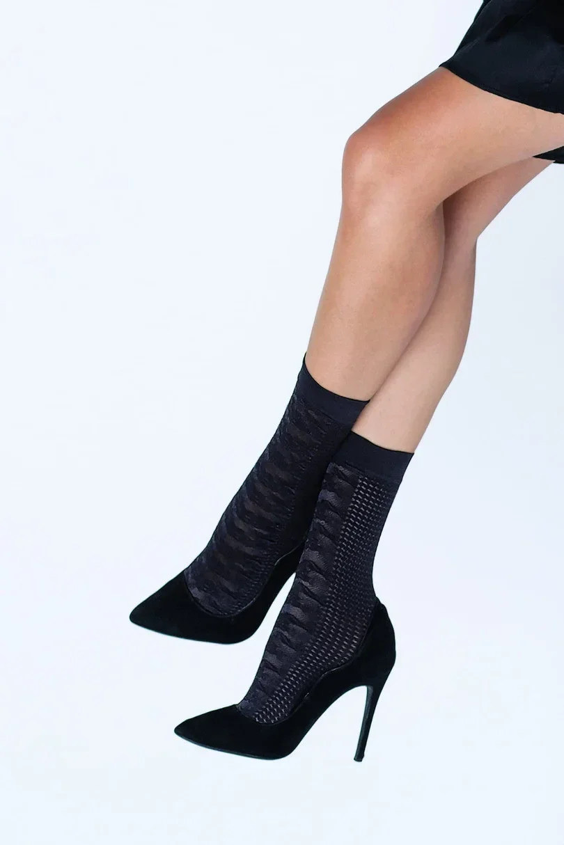 Ponožky jsou ozdobené geometrickým vzorem. Špičky, paty a lem jsou jednobarevné.