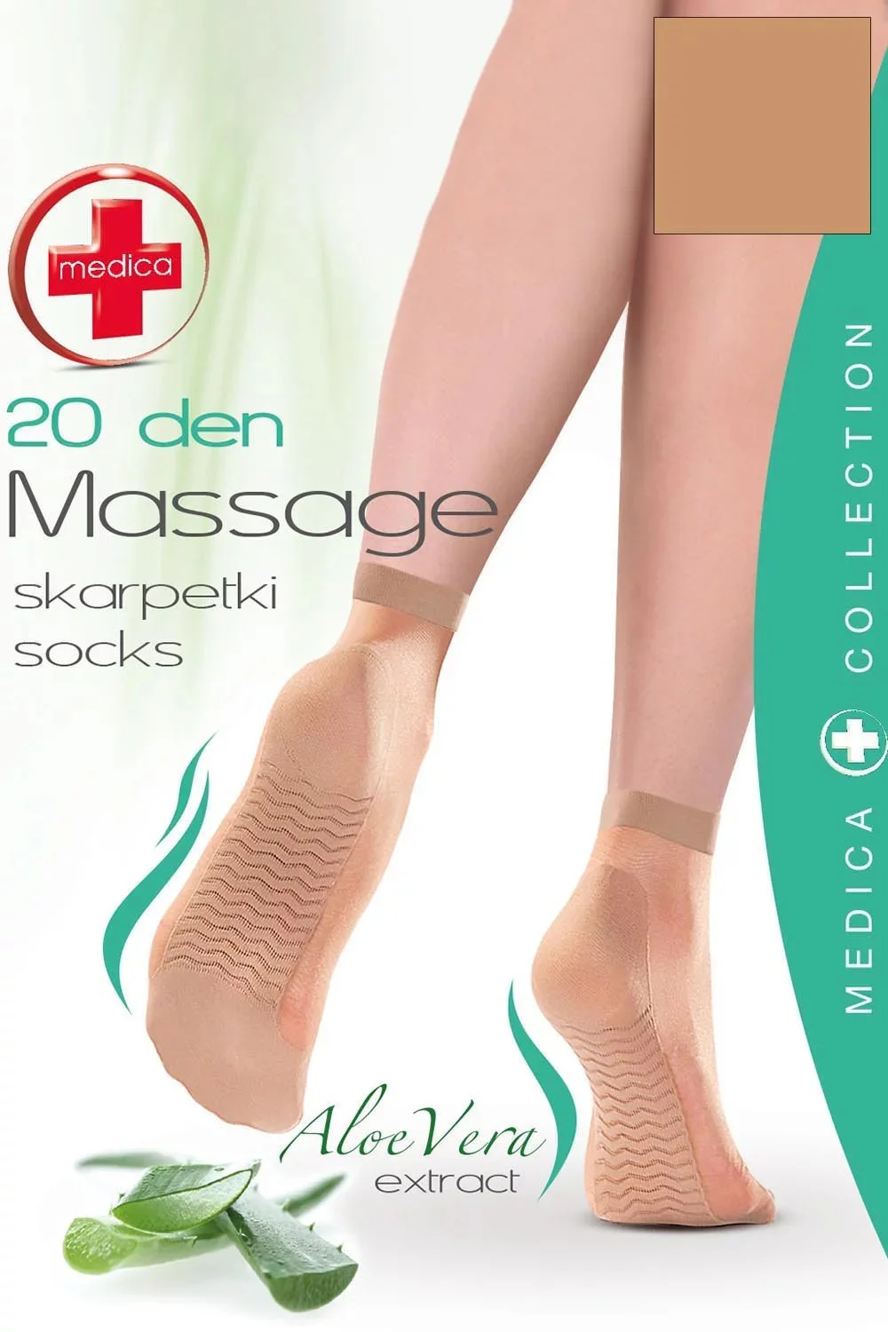 Ponožky s masážním efektem a nestahujícím lemem. Obsahují extrakt z aloe vera, které zvlhčuje kůži. 20 DEN.