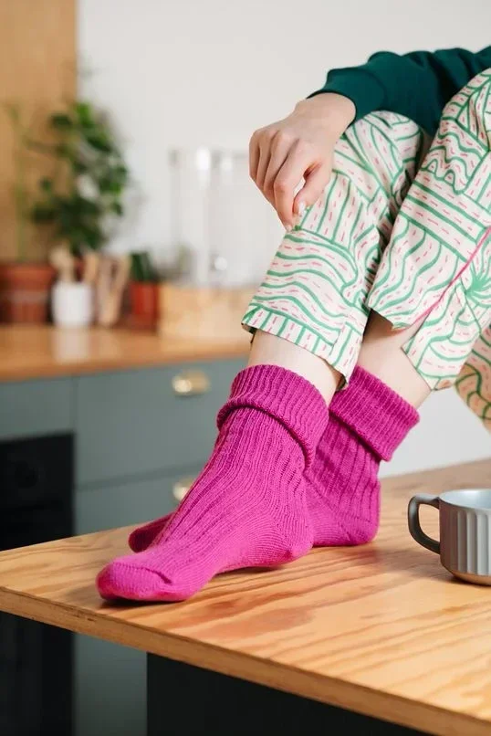 Ponožky jsou vyrobené z akrylu (70 %) a vlny (30 %). Model je pohodlný, jemně přiléhá k chodidlu a má lem, který netlačí.