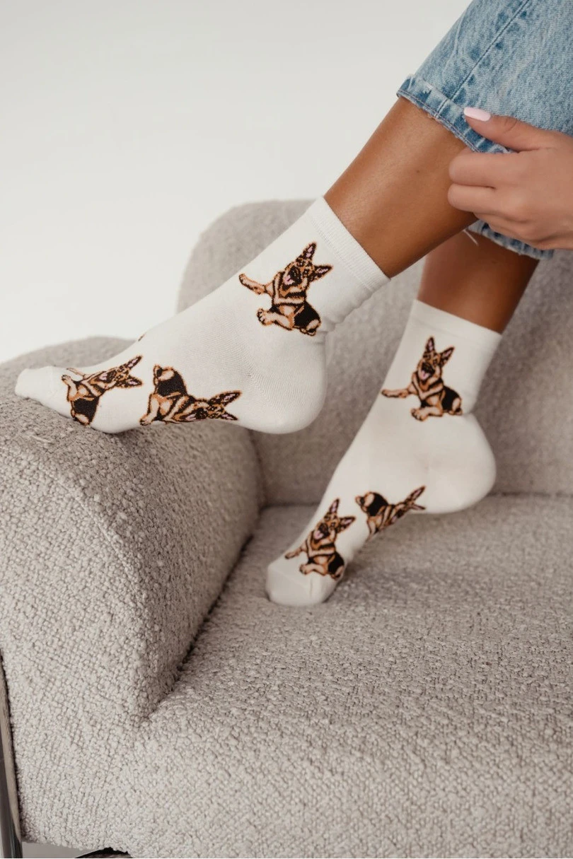 Dámské bavlněné ponožky s motivem velkých, věrných psů jsou vynikající volbou pro milovníky zvířat a lidi, kteří si cení pohodlí při každodenním nošení. Jsou vyrobeny z pečlivě vybrané, vysoce kvalitní bavlny a zajišťují vynikající prodyšnost, měkkost a pohodlí při nošení po celý den. Pružný materiál se dokonale přizpůsobí chodidlu a zaručuje volnost pohybu a pohodlí při každodenních aktivitách. Originální design s pěknými, velkými psy dodává ponožkám charakter a činí z nich jedinečný kus oblečení. Jsou ideální volbou pro ženy, které rády kombinují funkčnost se zajímavým, vtipným designem.