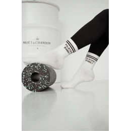 Dámské ponožky v odstínu ecru s hnědým nápisem „PILATES, BABE!“ jsou stylovým doplňkem pro každodenní nošení i volnočasové aktivity. Jemná světlá barva působí čistě a přirozeně, zatímco kontrastní nápis dodá outfitu moderní a lehce hravý detail. Ponožky se dobře hodí do tenisek a městské obuvi a využijete je nejen na běžné nošení, ale i jako příjemné zpestření na cestu do studia nebo na lekci.