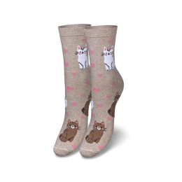 Béžové dámské ponožky s roztomilým motivem koček a srdcí jsou pohodlné a měkké. Vyrobené z kvalitního materiálu, který poskytuje pohodlí během celého dne. Ideální pro každodenní nošení nebo jako hravý doplněk outfitu.