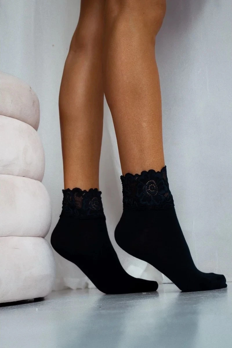 Černé dámské ponožky se širokou krajkou jsou měkké, pohodlné a ideální pro každodenní nošení. Elegantní krajka dodává ponožkám stylový a jemný vzhled. Kvalitní materiál poskytuje příjemný pocit na noze a dobrou prodyšnost.