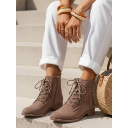 Kozačky vyrobené z ekologického semiše s tkanou perforovanou strukturou jsou navrženy tak, aby podporovaly prodyšnost a lehké používání v přechodném období. Nízký podpatek podporuje stabilitu při každodenní chůzi. Kombinace šněrování a zipu umožňuje přesné uchycení kolem kotníku.
