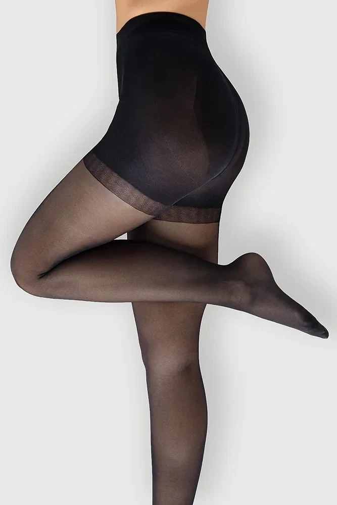 Elastické, stahovací punčochové kalhoty 40 den. Ideálně modelují linii boků a stehen a zároveň splošťují bříško. Struktura push-up pozvedá a zakulacuje zadeček. Díky rovnoměrněmu stisku dobře přiléhají a jsou velice pohodlné.