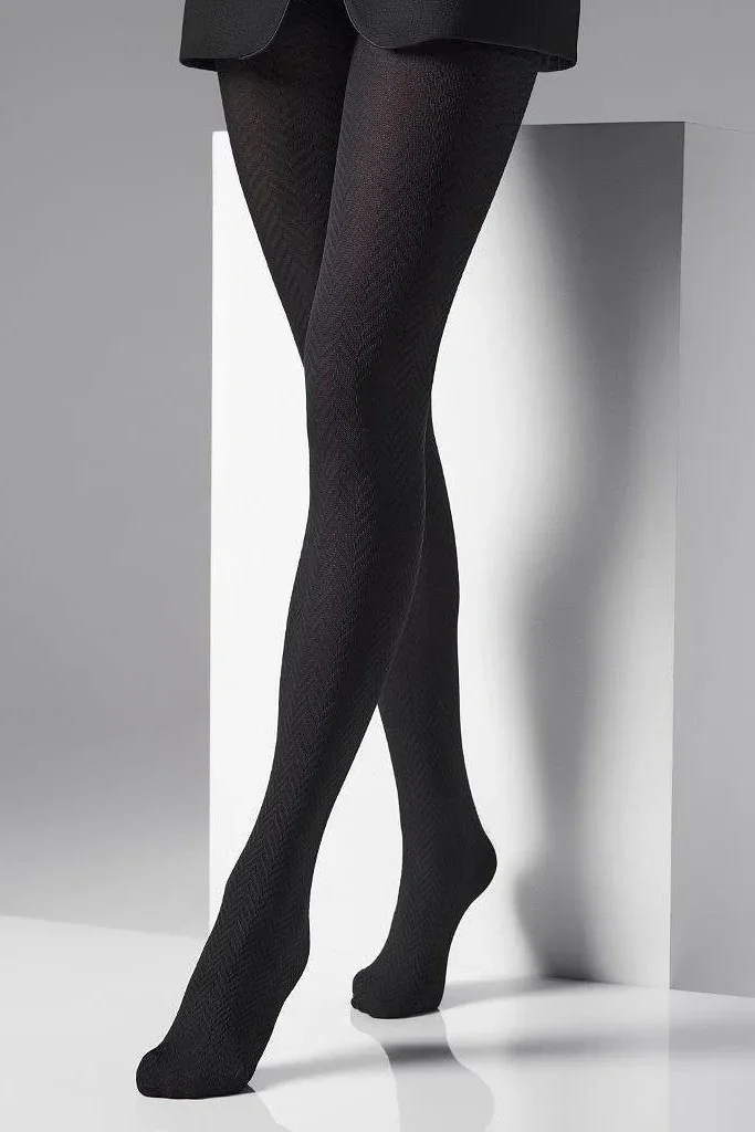 Punčocháče jsou ozdobené jemným vzorem "rybí kost". Model má malý klín a nemá vyznačené zesílené špičky.