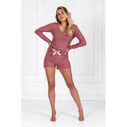 Dámské pyžamo sestávající z halenky a šortek. Halenka s dlouhými rukávy a špičatým výstřihem. Krátké šortky bez kapes, ozdobná mašle v pase. Pyžamo je vyrobeno z látky příjemné na dotek.