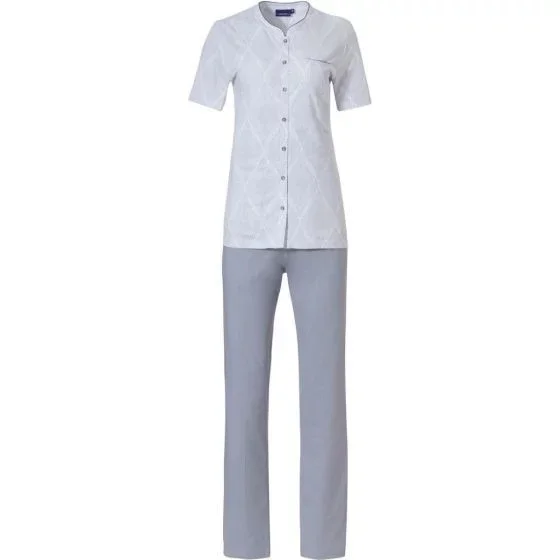 Světle šedé dámské pyžamo na knoflíky od značky Pastunette. Pyžamová košile má krátké rukávy. Dlouhé pyžamové kalhoty mají šedou barvu.