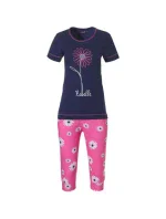 Dámské pyžamo od Rebelle s krátkým rukávem. Na tmavě modrém vršku je obrázek sedmikrásky a text - Rebelle -. Polodlouhé pyžamové kalhoty jsou růžové barvy s potiskem kopretin.