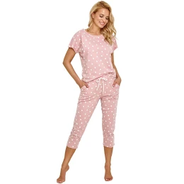Dámské pyžamo 2860 Chloe pink TARO - z vysoce kvalitní a měkké bavlny - tričko je růžové barvy s krátkými rukávy - tříčtvrteční kalhoty - zdobené bílými puntíky - zavazování v pase