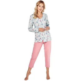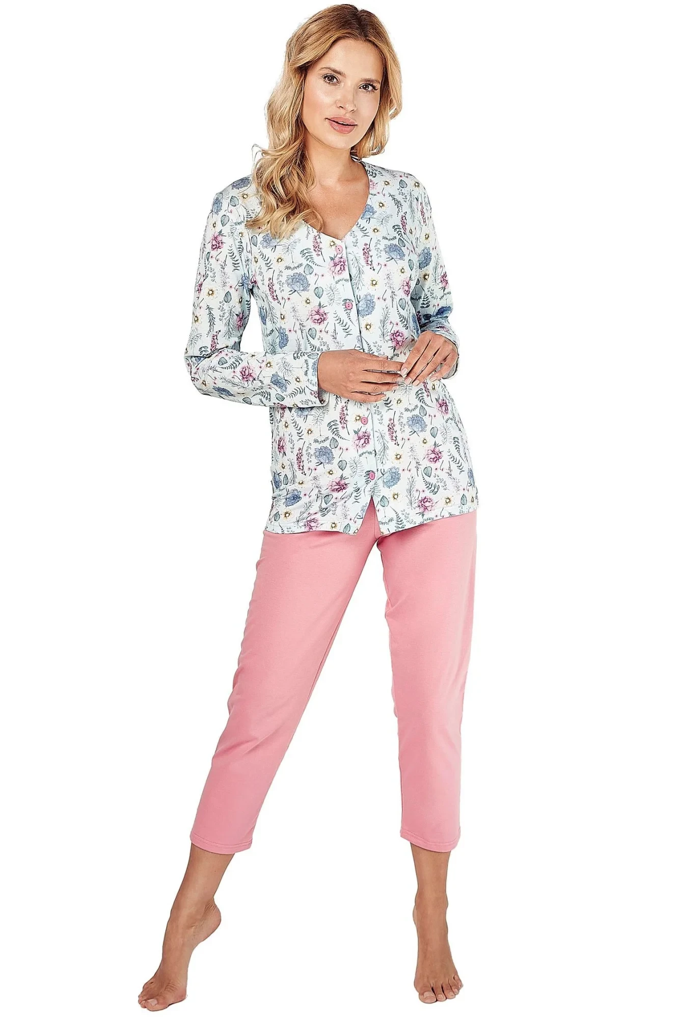 Dámské pyžamo 2991 Valencia TARO - z vysoce kvalitní a měkké bavlny - tričko je bílé barvy s dlouhými rukávy - s květinovým motivem - zapínání na knoflíky - dlouhé kalhoty růžové barvy