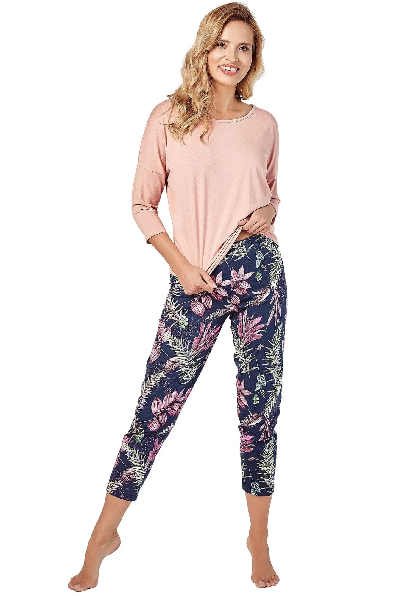 Dámské pyžamo 3000 Vivian TARO - růžová barva - vyrobené z vysoce kvalitní a měkké viskózy - tričko je bílé barvy s tříčtvrtečními rukávy - vzorované kalhoty - materiálové složení kalhot: 100% bavlna