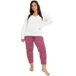Dámské pyžamo 3005 Estella Taro - vyrobené z vysoce kvalitní a měkké bavlny - tričko je bílé barvy s dlouhými rukávy - půlkulatý výstřih s knoflíky - vzorované capri kalhoty