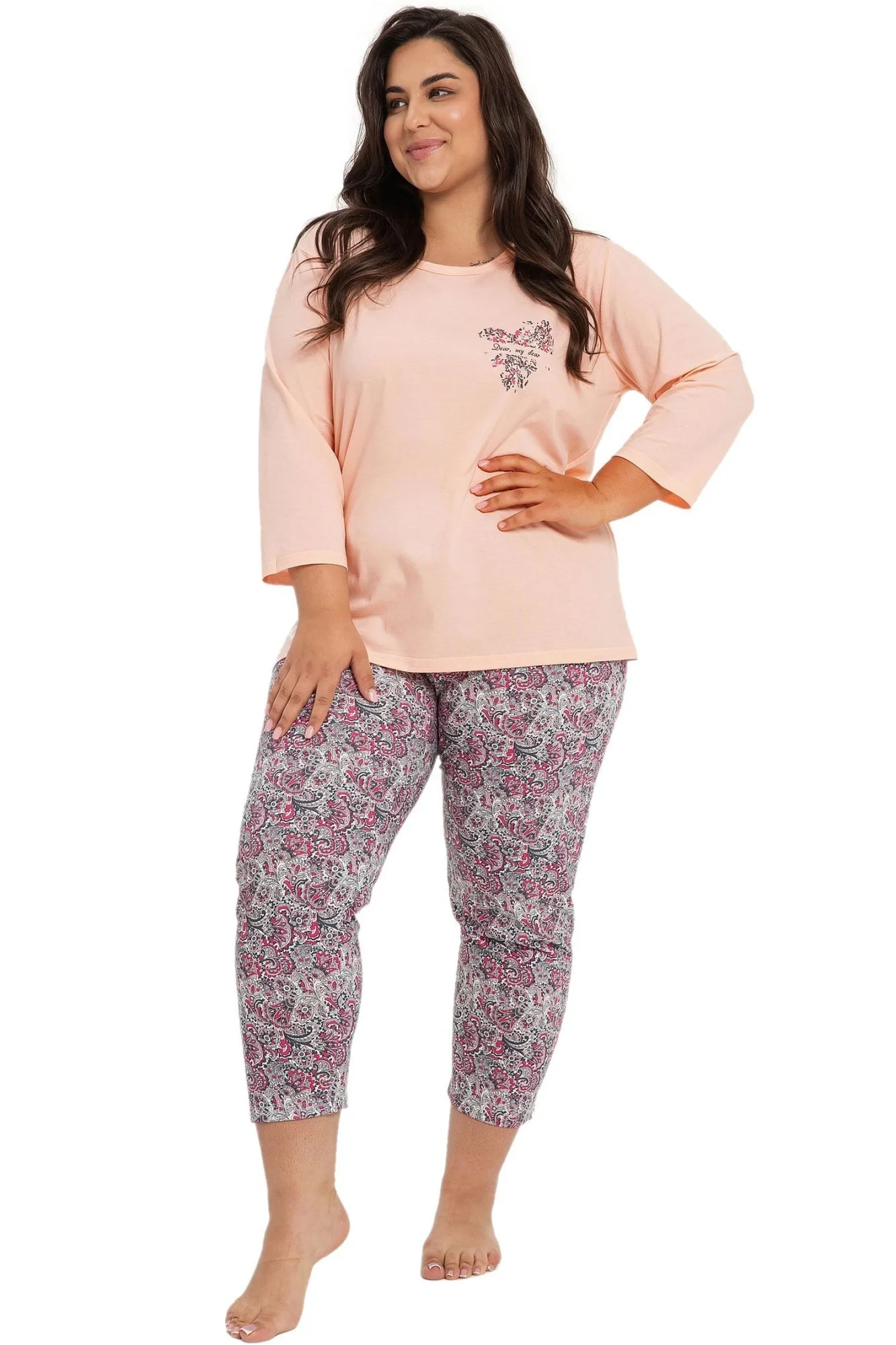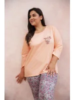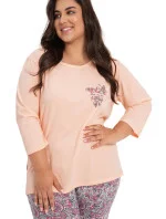 Dámské pyžamo 3010 Melissa TARO - vyrobené z vysoce kvalitní a měkké bavlny - tričko je růžové barvy s tříčtvrtečními rukávy - přední strana ozdobená potiskem - vzorované kalhoty