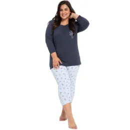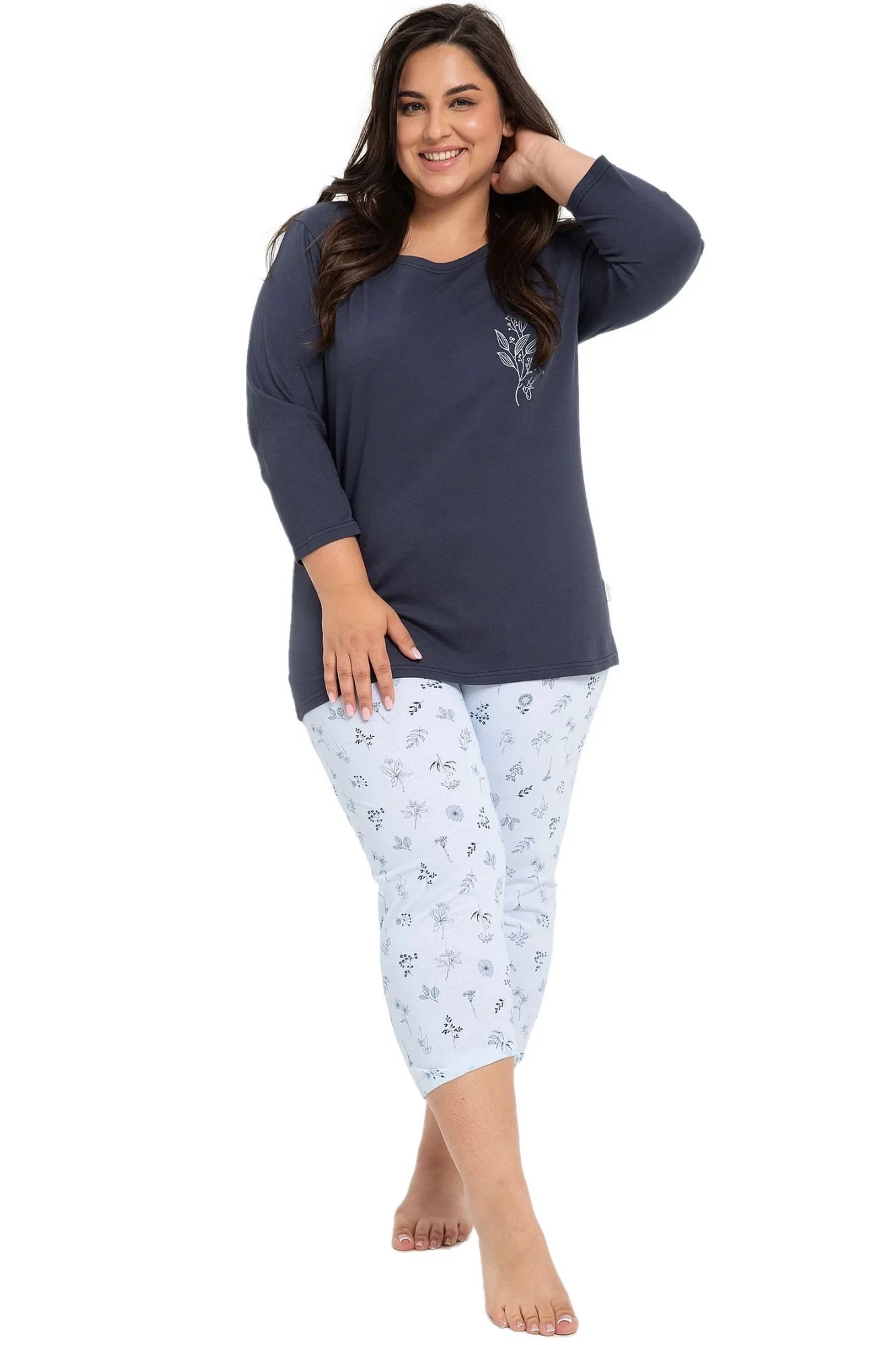 Dámské pyžamo 3012 Magnolia Taro - vyrobené z vysoce kvalitní a měkké bavlny - tričko je tmavě modré barvy s dlouhými rukávy - ozdobené na přední straně potiskem - vzorované capri kalhoty