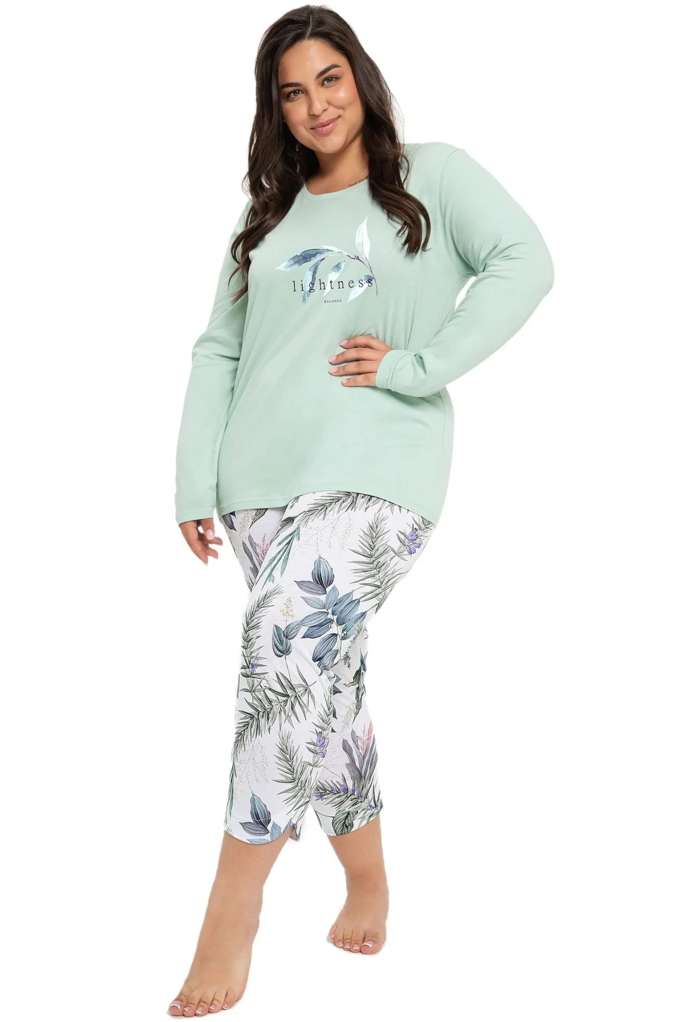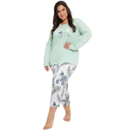 Dámské pyžamo 3016 Ariana Taro - vyrobené z vysoce kvalitní a měkké bavlny - tričko je zelené barvy s dlouhými rukávy - ozdobené na přední straně potiskem - vzorované capri kalhoty