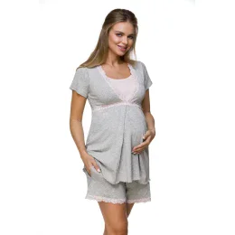 Dvoudílné dámské těhotenské pyžamo, které je vyrobené z šedé tkaniny a ozdobné růžové krajky.