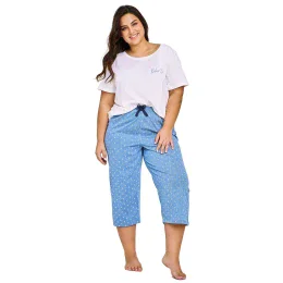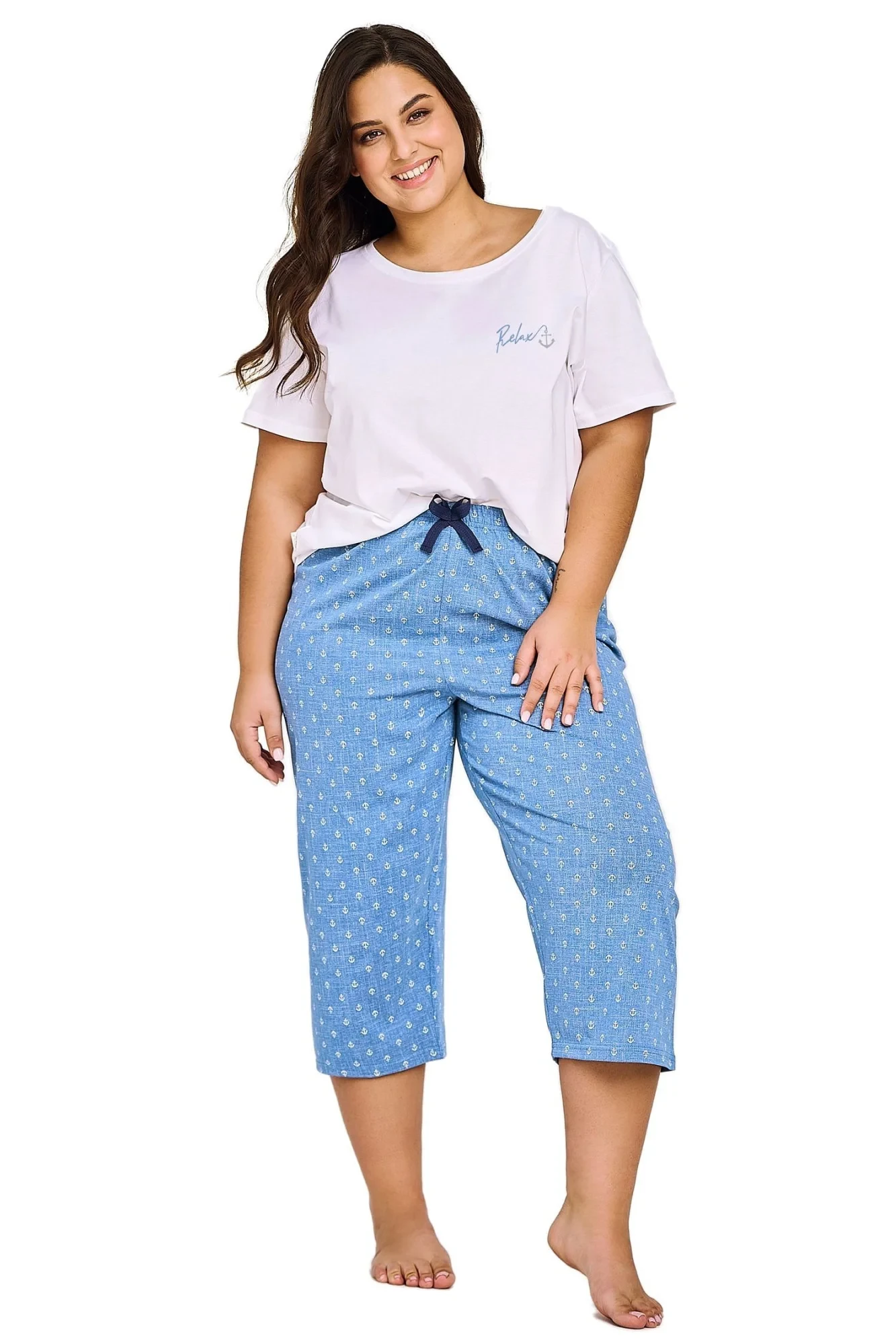 Dámské pyžamo 3162 Leona TARO - z vysoce kvalitní bavlny - tričko je bílé barvy s krátkými rukávy - zdobené potiskem na přední straně - vzorované kalhoty - ozdobená mašle v pase