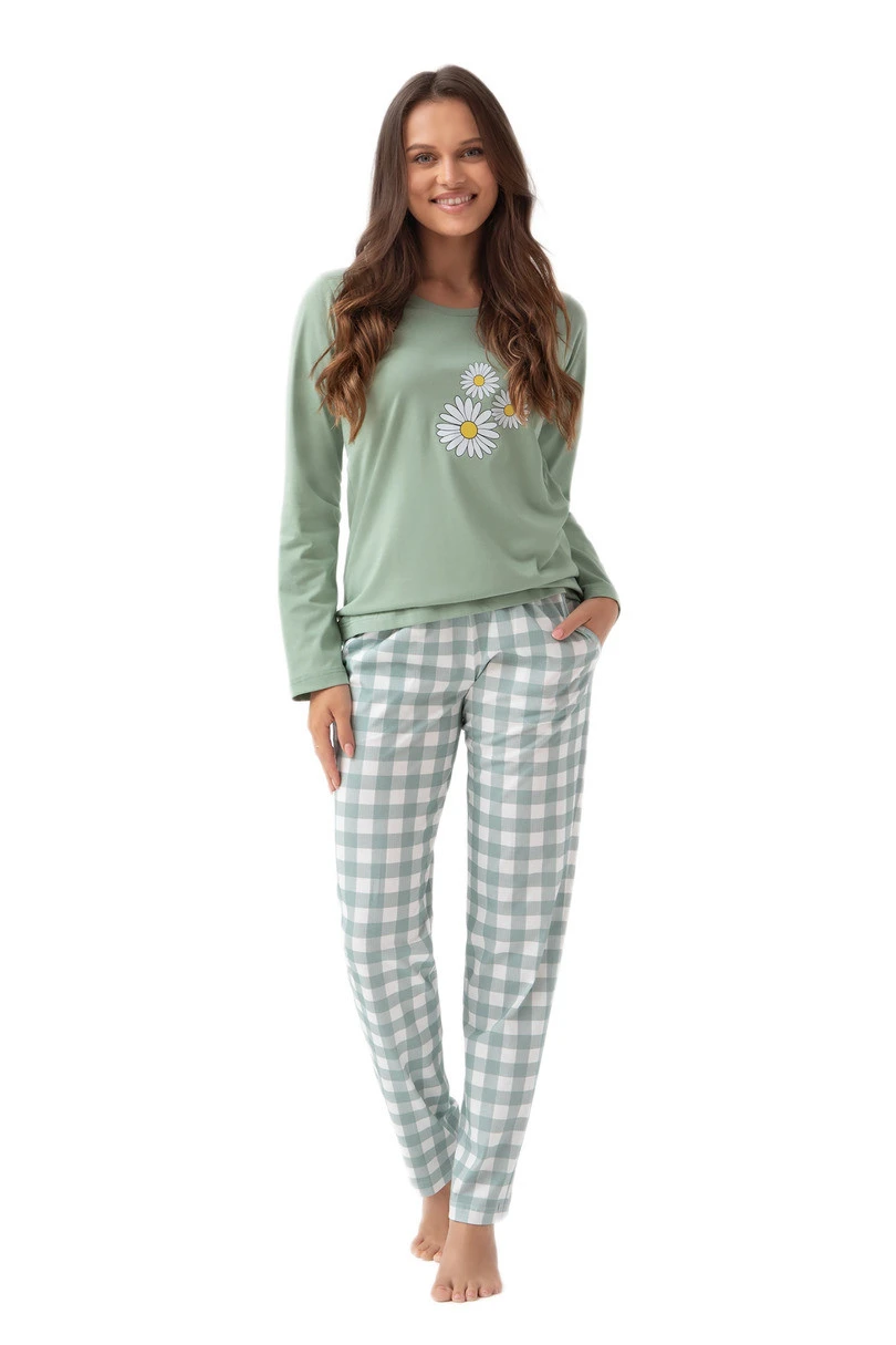 Stylowa piżama damska 320 J/25 to idealne połączenie kobiecego wzornictwa i codziennego komfortu. Górę zestawu stanowi zielona bluzka z długim rękawem i uroczym nadrukiem stokrotek, która wnosi do domowego stroju nutę świeżości i lekkości. Bluzka ma klasyczny, okrągły dekolt zapewniający wygodę noszenia. Do kompletu dołączono długie spodnie w kremowo-zieloną kratę, wyposażone w praktyczne kieszenie i luźny krój, gwarantujący pełną swobodę ruchów. Całość wykonana została z wysokiej jakości, 100% bawełny – miękkiej i oddychającej.