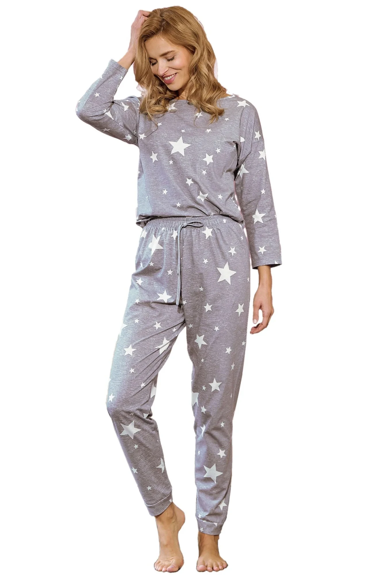 Dámské pyžamo 3208 Lizzie TARO - z vysoce jakostní bavlny - tričko šedé barvy s tříčtvrtečními rukávy - dlouhé kalhoty šedé barvy - zdobené potiskem bílých hvězdiček - vázání v pase