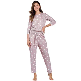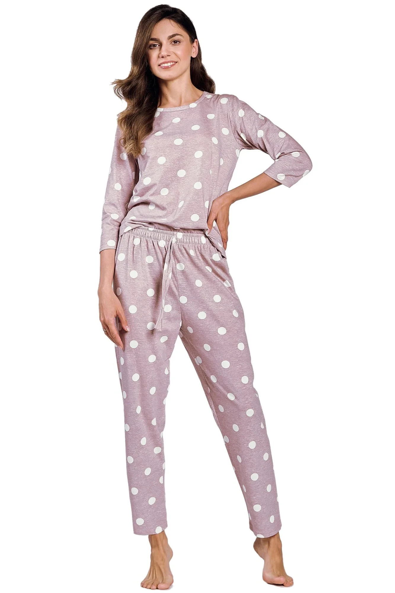 Dámské pyžamo 3212 Dolly TARO - z vysoce jakostní bavlny - tričko fialové barvy s tříčtvrtečními rukávy - dlouhé kalhoty fialové barvy - zdobené potiskem bílých puntíků - zavazování v pase