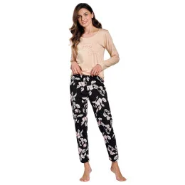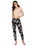 Dámské pyžamo 3234 Katie TARO - z vysoce jakostní bavlny - tričko béžové barvy s dlouhými rukávy - na přední straně zdobené potiskem - vzorované kalhoty