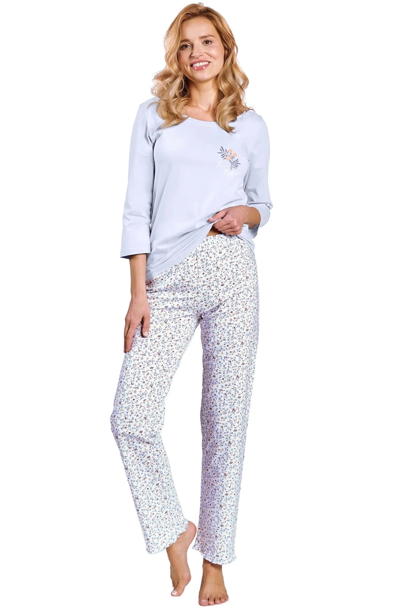 Dámské pyžamo 3240 Ariella blue TARO - z vysoce jakostní bavlny - tričko světle modré barvy s tříčtvrtečními rukávy - na přední straně zdobené potiskem - vzorované dlouhé kalhoty