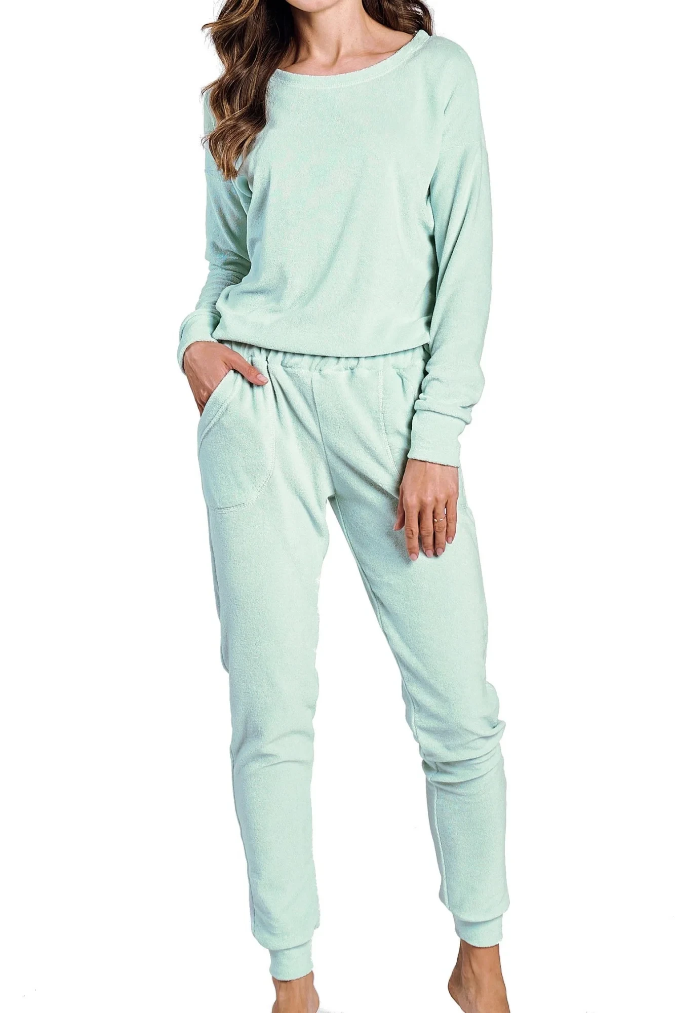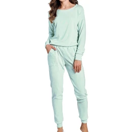 Dámské pyžamo 3243 Jessie TARO - z vysoce jakostní froté bavlny - tričko zelené barvy s dlouhými rukávy - zelené dlouhé kalhoty s kapsami na bocích - rukávy i nohavice zakončené žebrovaným lemováním