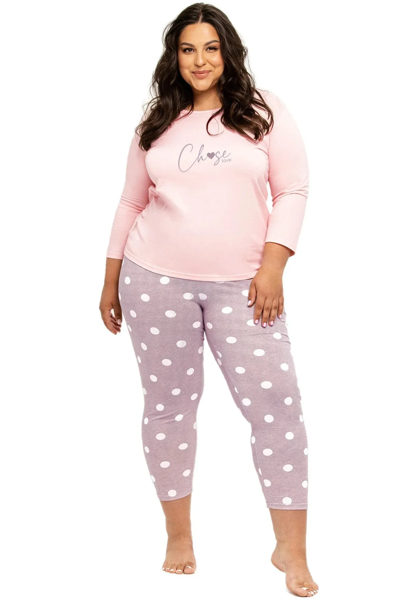 Dámské pyžamo 3268 Libby TARO - růžová barva - z vysoce jakostní bavlny - tričko růžové barvy s dlouhými rukávy - zdobené na přední straně potiskem - dlouhé kalhoty růžové barvy s potiskem bílých puntíků - s kapsami - guma v pase