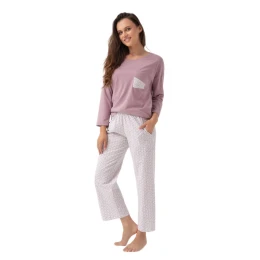 Piżama damska 339 J/25 to wygodny komplet stworzony z myślą o kobietach, które cenią subtelny styl i naturalne materiały. Bluzka z rękawem 7/8 w odcieniu kakao została wzbogacona o kieszonkę z tym samym wzorem, co spodnie, tworząc spójną, estetyczną całość. Spodnie o długości 7/8, z kieszeniami, zdobione są delikatnym motywem beżowych rozetek na tle ecru. Wykonana w 100% z bawełny piżama jest miękka, oddychająca i doskonała na każdą porę roku.