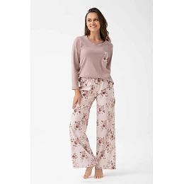 - spodní díl tvoří dlouhé široké kalhoty s výrazným potiskem růžových a mátových květů