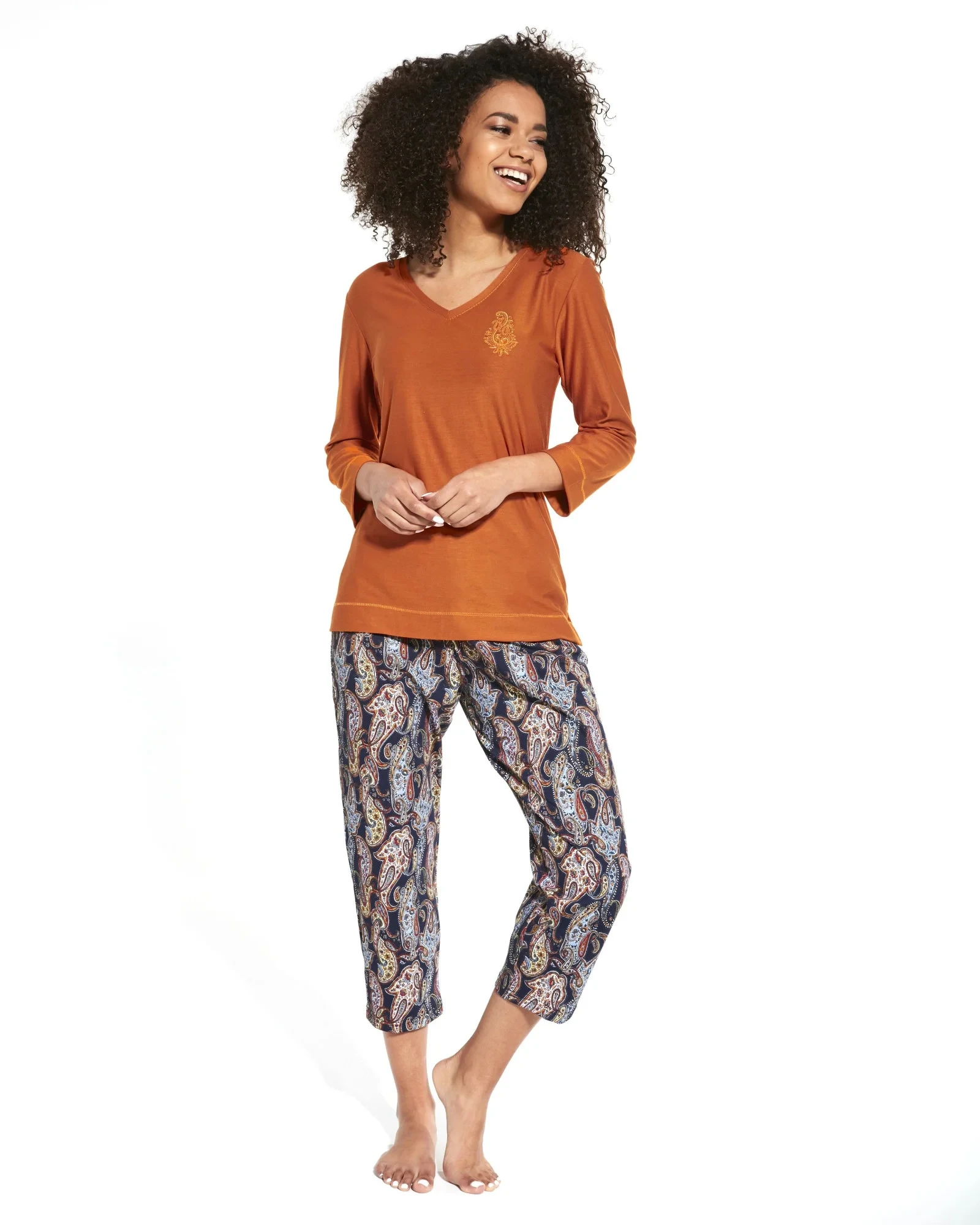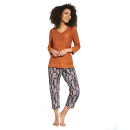 Dámské pyžamo 389/252 Ornament Cornette - bavlněný materiál je poddajný a jemný na dotek - tričko měděné barvy s dlouhými rukávy - pohodlné vzorované kalhoty - pyžamo je vhodné i na denní nošení