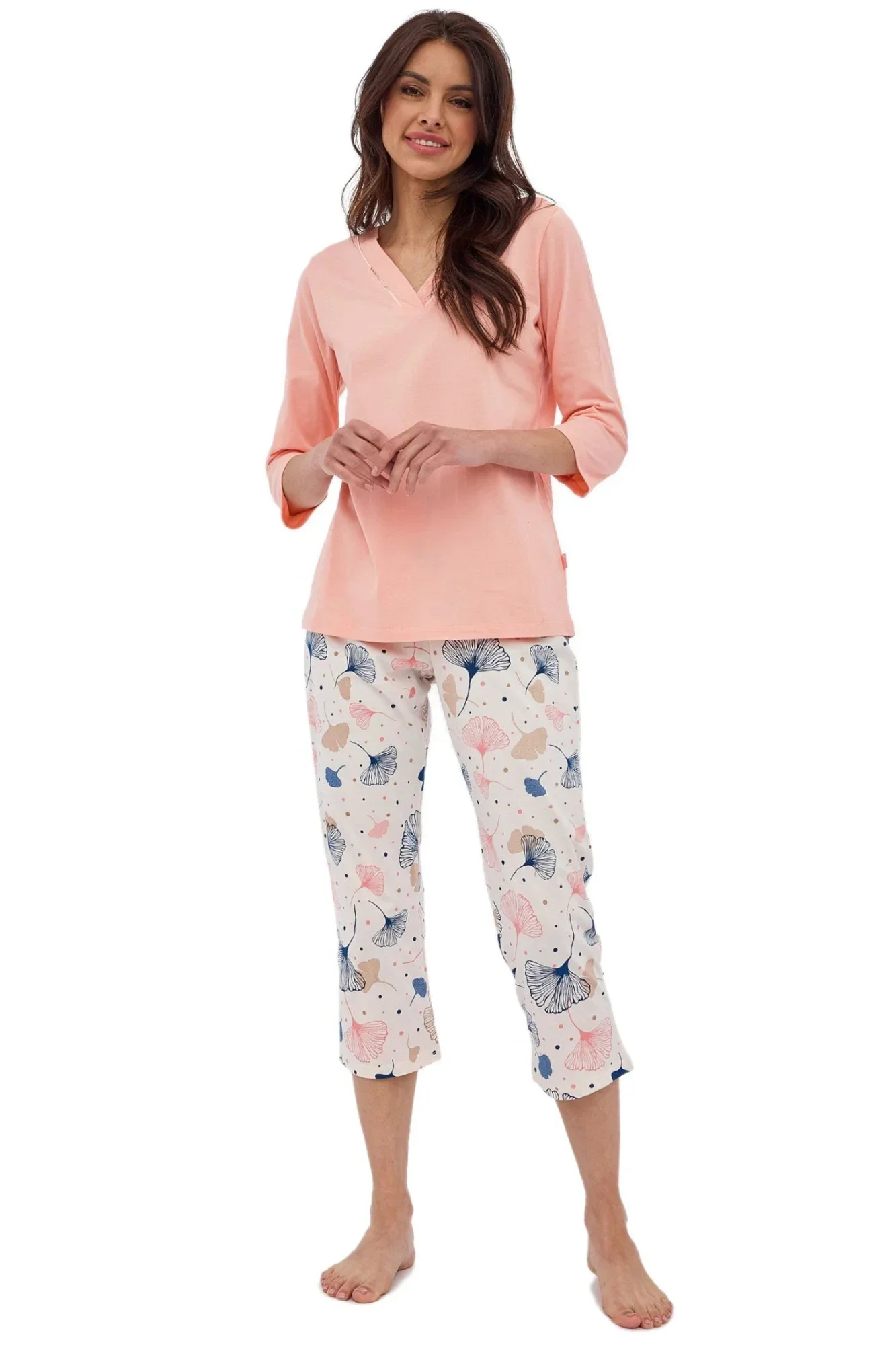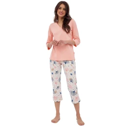 Dámské pyžamo 389/389 Nina CORNETTE - z vysoce jakostní bavlny - růžové tričko s tříčtvrtečními rukávy - se vzorem - vzorované kalhoty - v pase guma - pyžamo je vhodné i na denní nošení