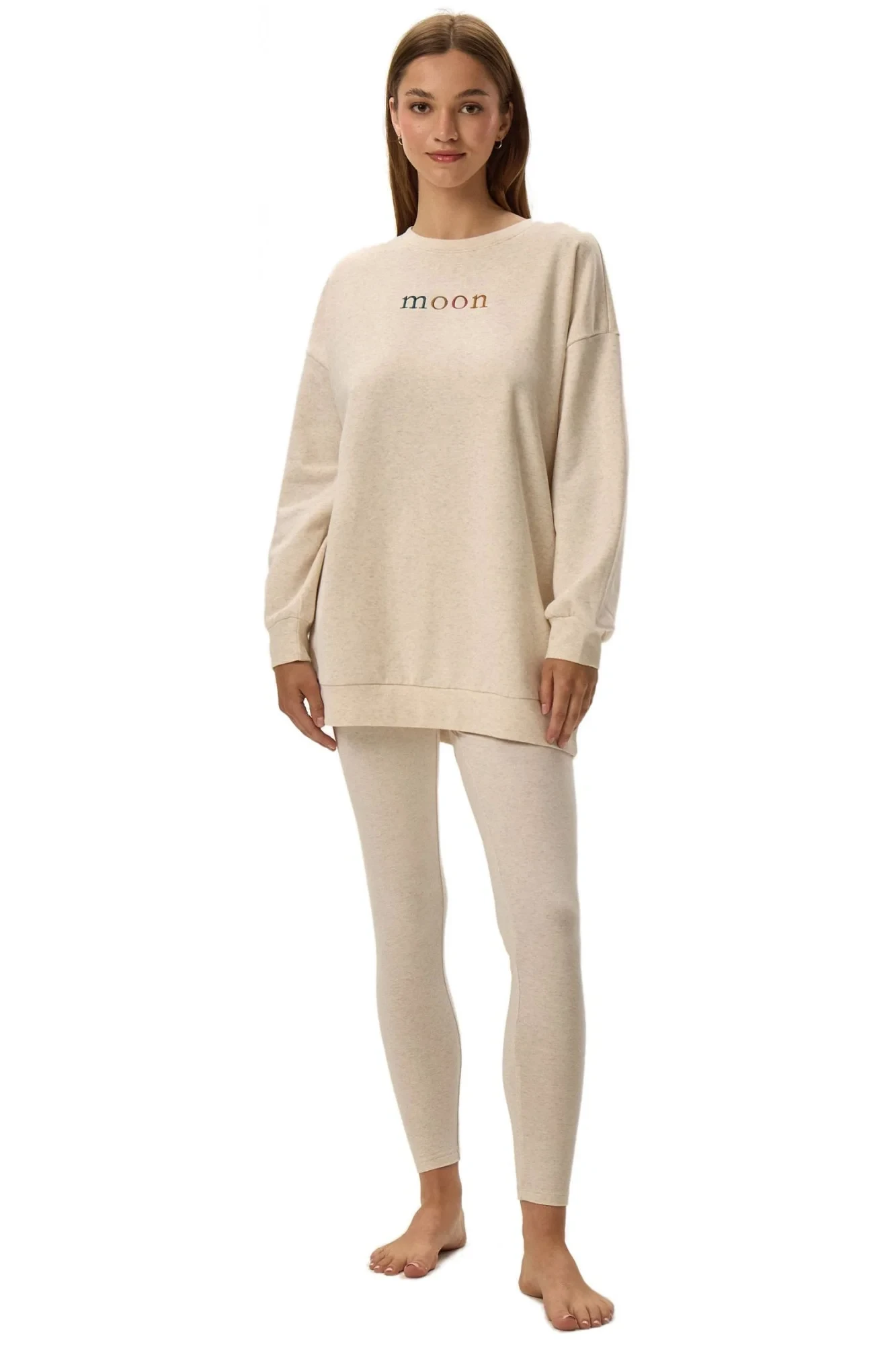 Dámské pyžamo 41870 Fune HENDERSON - z vysoce jakostní bavlny - béžová mikina s dlouhými rukávy - zevnitř zateplená - na přední straně ozdobená potiskem - dlouhé legíny béžové barvy - rukávy, nohavice a spodní část mikiny zakončené lemem - materiálové složení legín: 77% bavlna + 18% polyester + 5% elastan