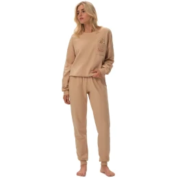 Dámské pyžamo 41899 Fawn HENDERSON - z vysoce jakostní bavlny - halenka béžové barvy s dlouhými rukávy - půlkulatý výstřih - na přední straně zdobená potiskem s kapsičkou - dlouhé kalhoty béžové barvy s kapsami - široký elastický pas - lemy nohavic a rukávů z žebrovaním