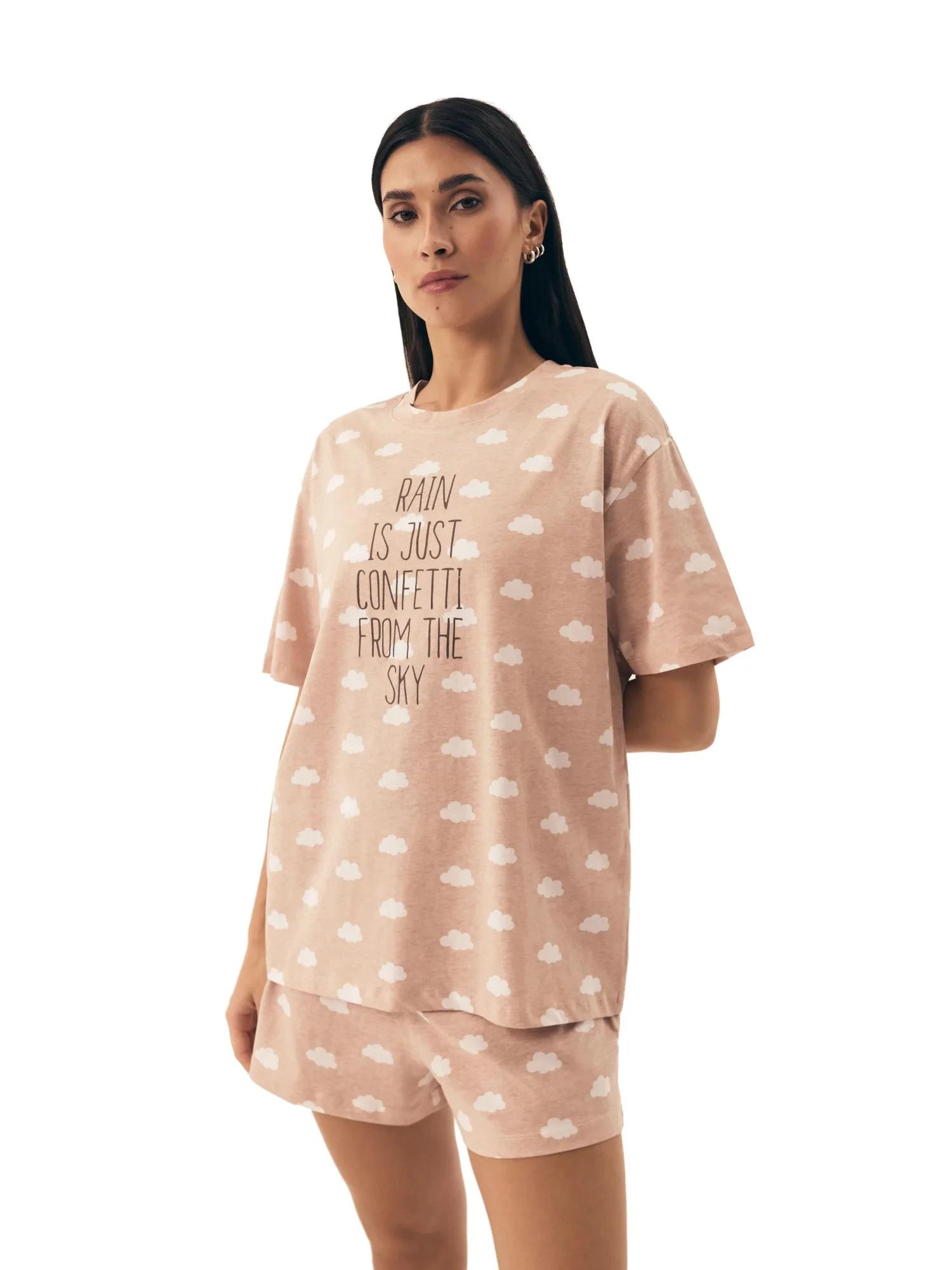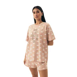 Dámské pyžamo 42647 Nubes HENDERSON - z vysoce jakostní bavlny - pískové tričko s krátkými rukávy - zdobené nápisem na přední straně - jednobarevné kraťasy - zdobené potiskem bílých mráčků - široký elastický pás