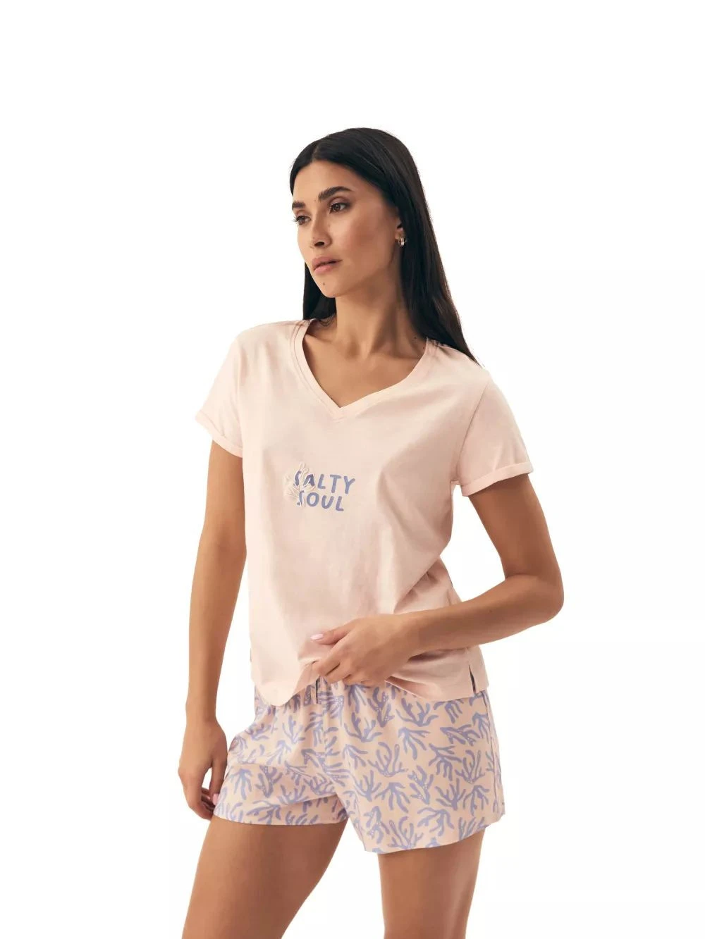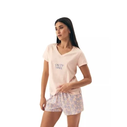 Dámské pyžamo 42669 Nadar HENDERSON - z vysoce jakostní bavlny - broskvové tričko s krátkými rukávy - zdobené potiskem na přední straně - vzorované šortky z viskózy - široký elastický pás se stahovací šňůrkou