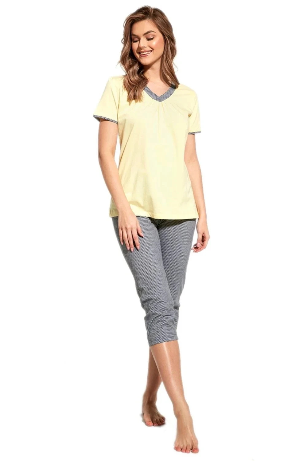 Dámské pyžamo 446/228 Cornette - bavlněný materiál je poddajný a jemný na dotek - žluté tričko s krátkými rukávy - pohodlné tříčtvrteční kalhoty - pyžamo je vhodné i na denní nošení