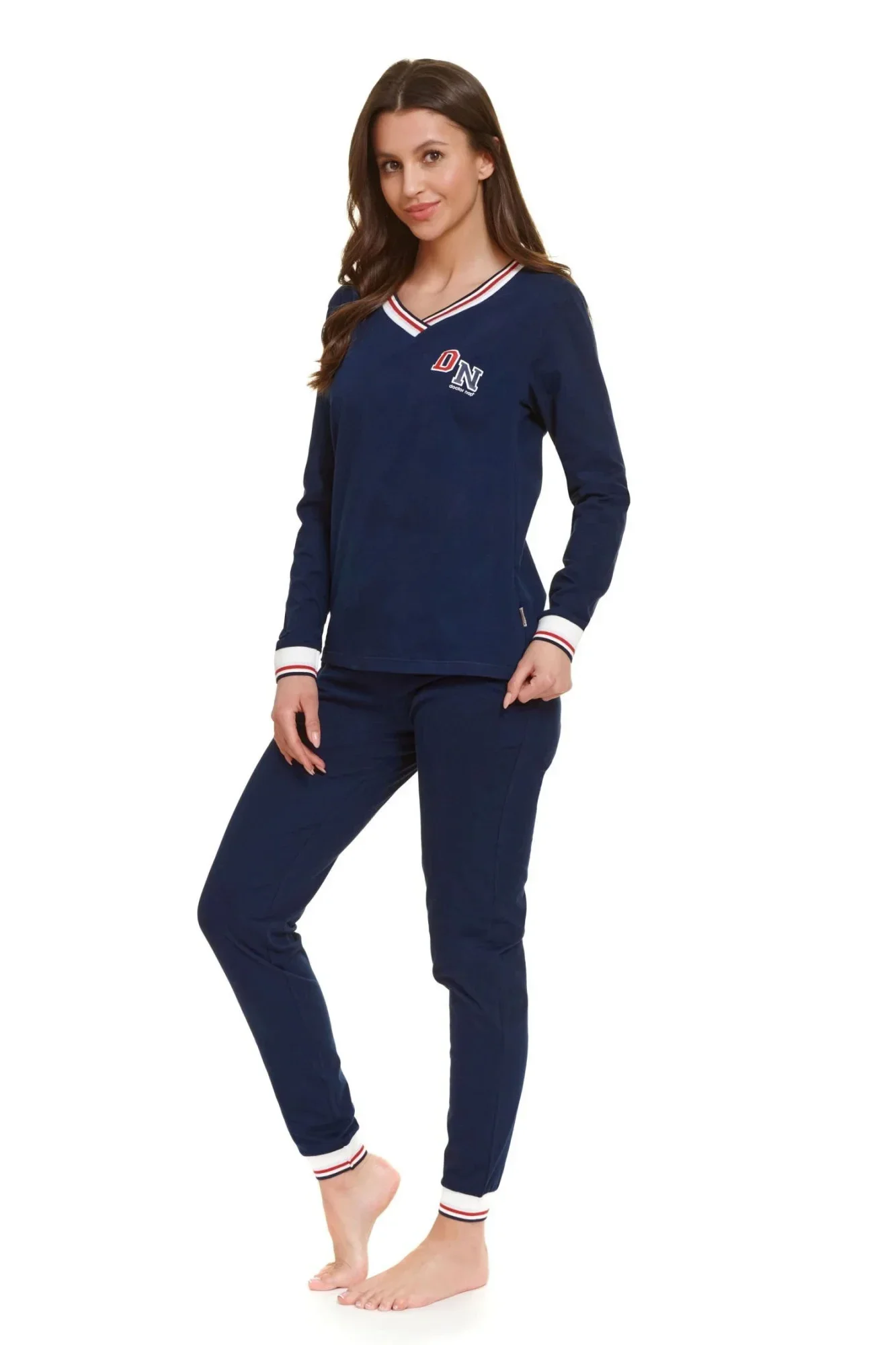 Dámské pyžamo 4504 Doctor Nap - vyrobené z velmi kvalitní a příjemné bavlny - tmavě modré tričko s dlouhými rukávy - na přední straně ozdobené potiskem - kontrastní lemování manžet a výstřihu - dlouhé tmavě modré kalhoty