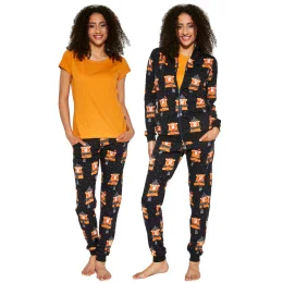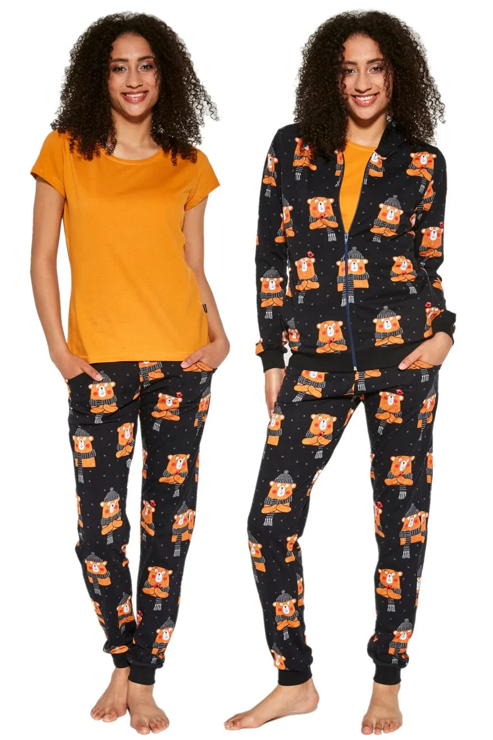 Dámské 3- dílné pyžamo 465/292 Bear 2 Cornette - je vyrobené z velmi kvalitní bavlny - oranžové tričko s krátkými rukávy - černá mikina zdobené potiskem se zapínáním na zip - dlouhé vzorované kalhoty
