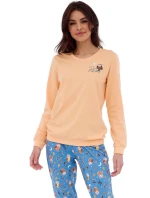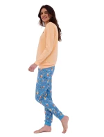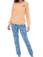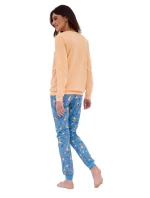 Dámské pyžamo z jemné bavlny. Halenka s dlouhými rukávy a žebrovanými manžetami, kulatý výstřih, jemný potisk na prsou, vzorované dlouhé kalhoty s žebrovanými manžetami, baleno v krabici.